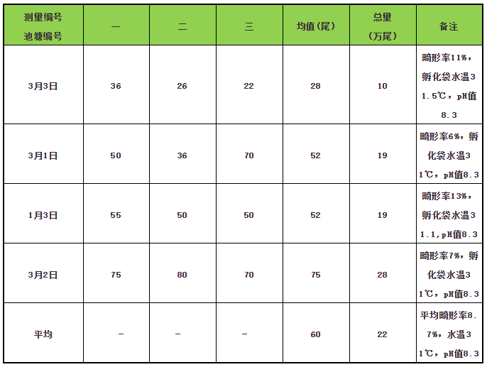 注:每个孵化袋气石处各打3杯(不同位置),每一杯500mL,再通过孵化袋中水的体积(190cm×140cm×70cm),评估总量