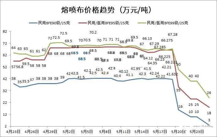 自5月18日起,熔喷布市场出现了深度的两极分化。一边是符合出口口罩要求的熔喷布极度缺乏,市场上基本看不到,导致80%的口罩厂停工;一边是所谓的“95+”布价格崩盘,从月初的70W一吨狂跌到20W以下仍无人问津。