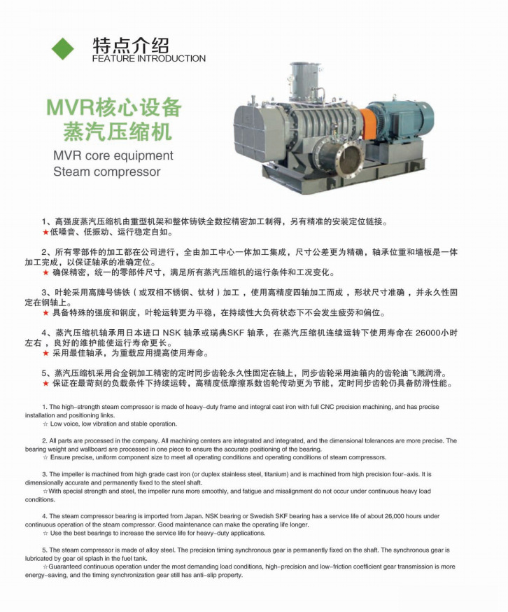1、高强度蒸汽压缩机有重型机架和整体铸铁全数控精密加工制得,另有精准的安装定位链接。