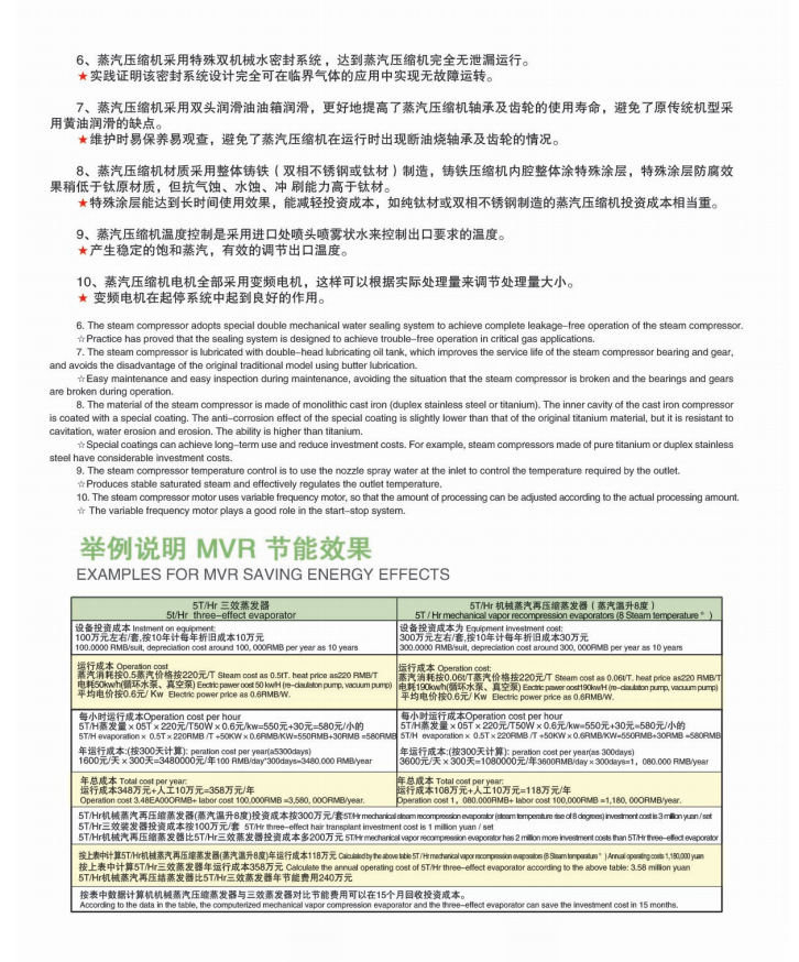 近年来国外已将该技术应用于化工、制药、造纸、污水处理、海水淡化等各类行业中去了,其工作过程就是将低品位的二次蒸汽经过压缩机压缩,温度、压力提高,热焓增加,然后进入换热器加热、冷凝,以充分利用蒸汽的潜热。此工艺除系统开车启动需要新鲜蒸汽,在整个系统运行中只需适当补给些新鲜蒸汽(补给屋不大)。